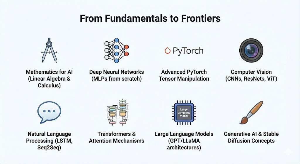 This course is designed for aspiring AI researchers, data scientists, and engineers who want to go beyond the basics. While we start from the mathematical foundations, having a basic understanding of Python is recommended. We move from beginner concepts to advanced, research-grade architectures.